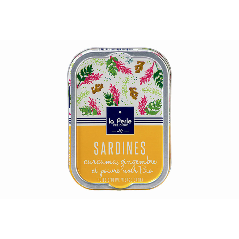 Ingrédients : Sardines fraîches, huile d'olive vierge extra, purée de curcuma et gingembre 4% (curcuma 45%, huile de tournesol, gingembre 16%, vinaigre d'alcool, sel, épices), eau, sel, poivre noir 0,78%, extrait de gingembre 0,05.