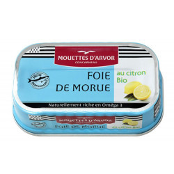 Cod liver in its exuded oil 94%, lemon* 5%, salt. *5% of ingredients of agricultural origin come from Organic Farming.