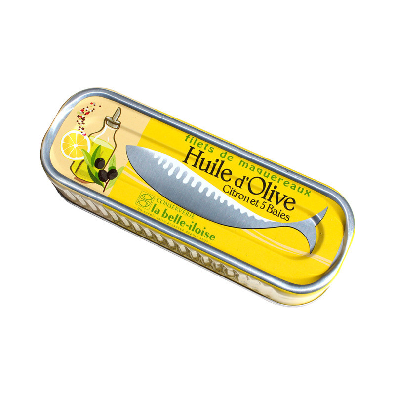 Mackerel fillets in olive oil, lemon and five bays, 175g.