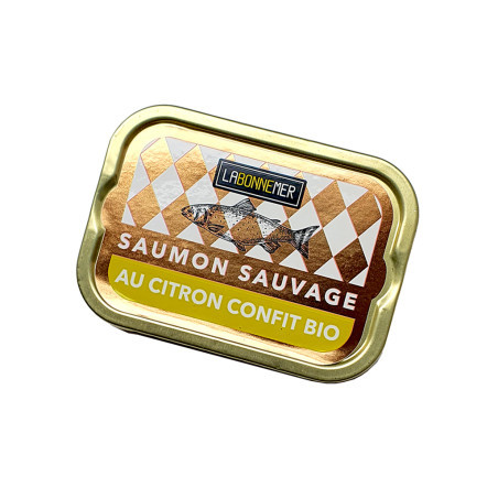 Ingredients: Wild salmon (Oncorhynchus keta) 70%, sunflower oil*, onions*, green olives*, candied lemon* 4%, salt, spices* and aromatic plants*. *29.6% of agricultural ingredients come from organic farming. Certified by Bureau Veritas Certification France - FR-BIO-10.