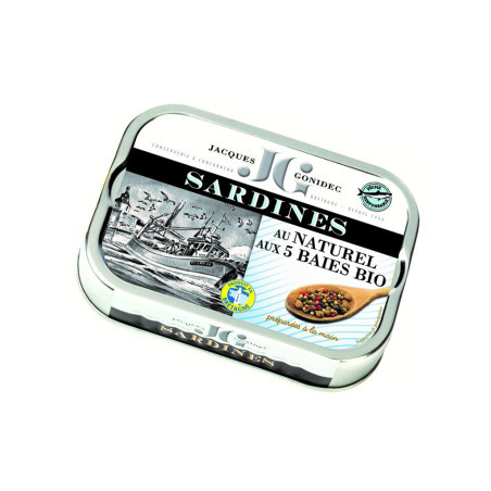Ingredients: sardines 75%, water, 5 berry mix* 0.9% (black pepper*, white pepper*, green pepper*, pink peppercorns*, coriander*), salt. *1.1% of products of agricultural origin come from Organic Farming. Certified by FR-BIO-10.