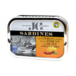 Sardines with preserved lemon and chilli in olive oil, prepared in the old way, 115g. "Jacques Gonidec" the brand of choice "Mouettes d'Arvor".