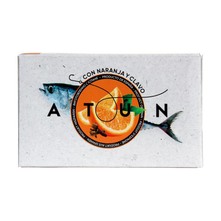 Light tuna (Thunus albacores) (73.64%), sunflower oil (19.26%), orange (6.10%), salt (0.8%) and cloves (0.2%).