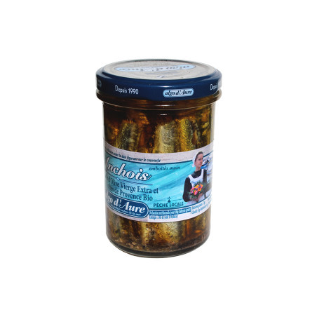 Anchois à l'huile d'olive vierge Bio façon sardines debout. Produit de grande qualité issu de la pêche locale.