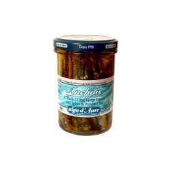 Anchois à l'huile d'olive vierge Bio façon sardines debout sublimés aux herbes de Provence . Produit de grande qualité issu de la pêche locale.