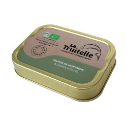 Les conserves écologiques et mise en boîte à la main. L'élevage de ces truites dans les eaux cristallines des sources et des torrents de montagne, leur confère une texture très proche de celle des poissons sauvages.
