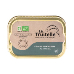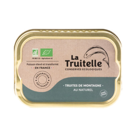 Les conserves écologiques La Truitelle contiennent, selon leur format, de deux à quatre petites truites arc-en-ciel entières, mises en boîte à la main. Leur élevage artisanal, dans les eaux cristallines des sources et des torrents de montagne, leur confère une texture très proche de celle des poissons sauvages.