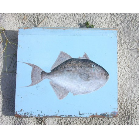 Peinture originale sur bois flotté, motif de baliste, 42 x 47 x 5 cm, par Diane Loranchet.