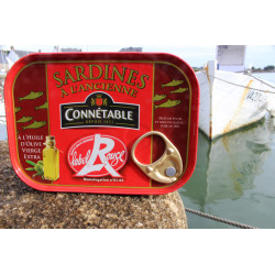 Pêche à la bolinche, préparation traditionnelle. Sardines de fraîcheur extra. Certifié par : QUALITÉ-FRANCE SAS. C'est dans la plus ancienne des conserveries encore en activité, que sont préparées depuis 1853 les sardines à l'ancienne Connétable. Pêchées le long des côtes bretonnes, préparées à la main, ces sardines sont nappées d'huile d'olive vierge extra pour le plus grand plaisir des gourmets.