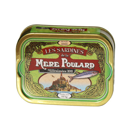 La Mère Poulard propose de très jolies boîtes de sardines millésimées à partir de produits frais et de qualité. Des sardines et de l'huile d'olive vierge extra.